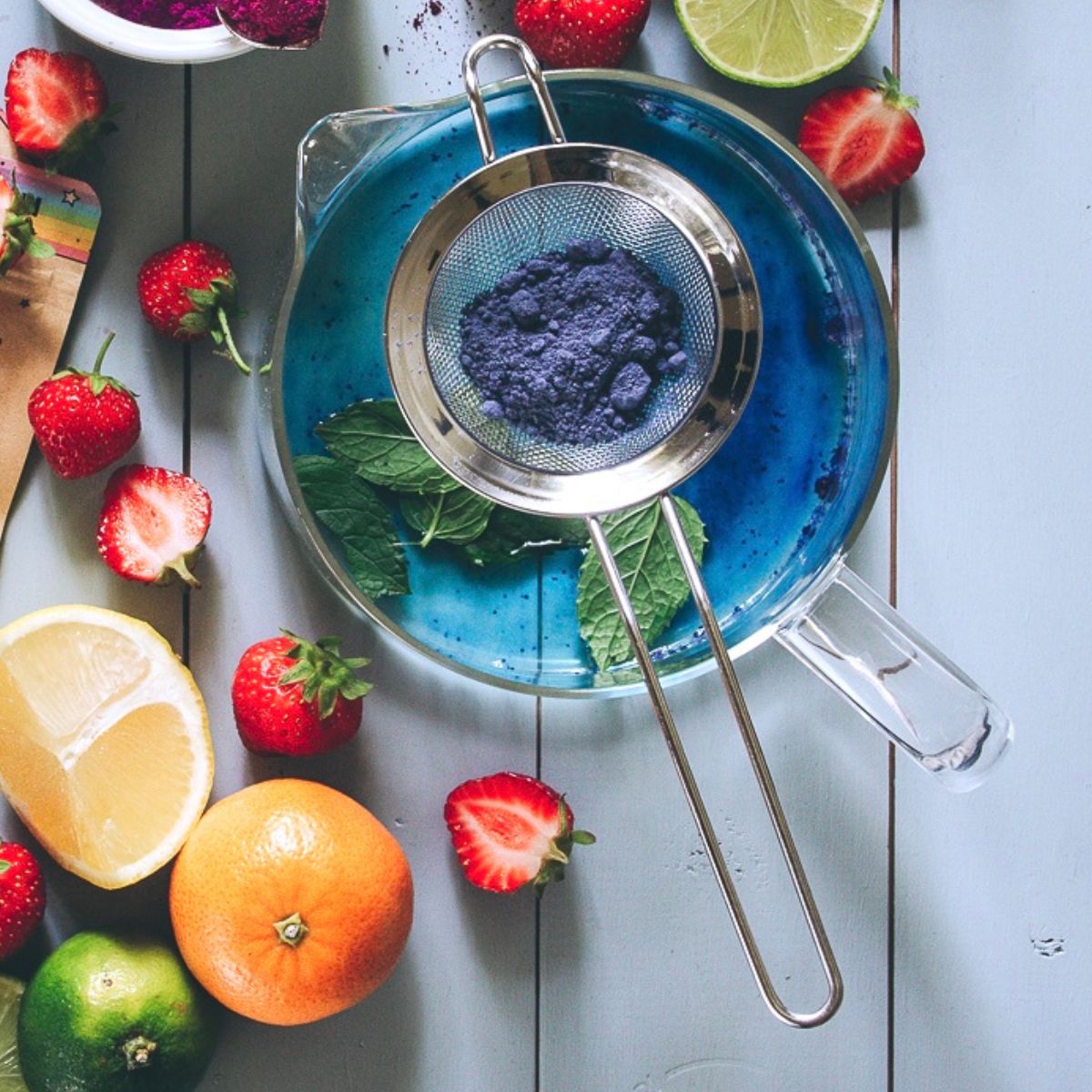 - This powder is PH sensitive and react to acidic liquids such as lemon or lime by changing color from blue to pink.